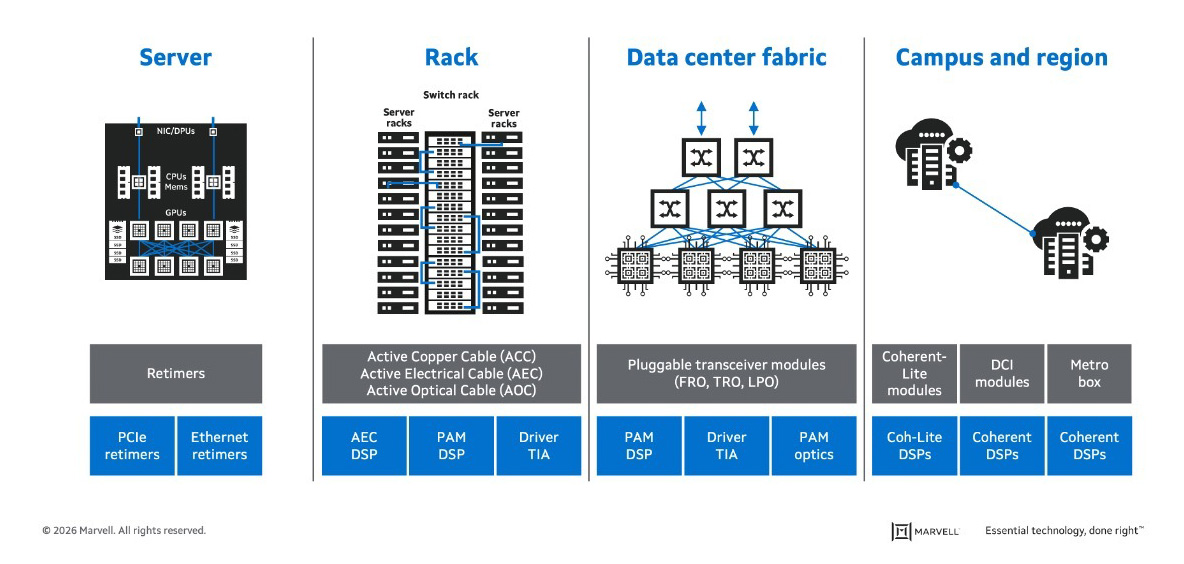 By leveraging its in-house analog and digital technology, Marvell offers ACCs, AECs and AOCs as a comprehensive solution for data center rack connectivity.