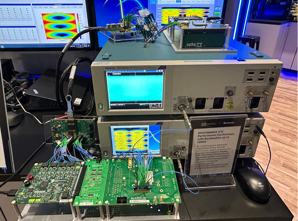 A Marvell PCIe 7.0 SerDes running at 128 GT/s transmits signals through the TeraHop optical module at OFC 2025.