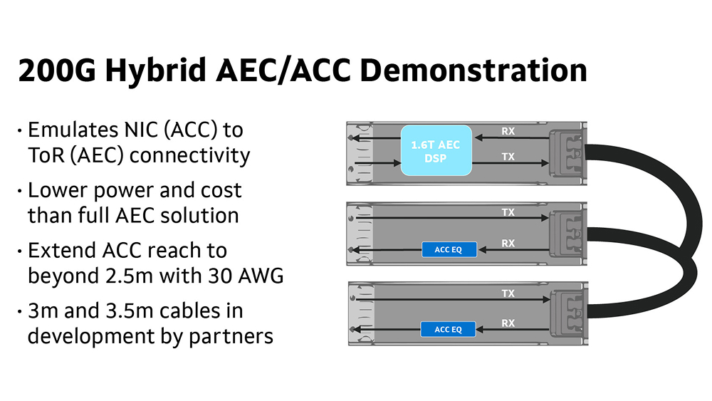 Hybrid AEC/ACC cables combine technologies from both for a solution that delivers a longer, AEC-like reach and the low latency, low power, low cost and low complexity benefits of ACC designs.